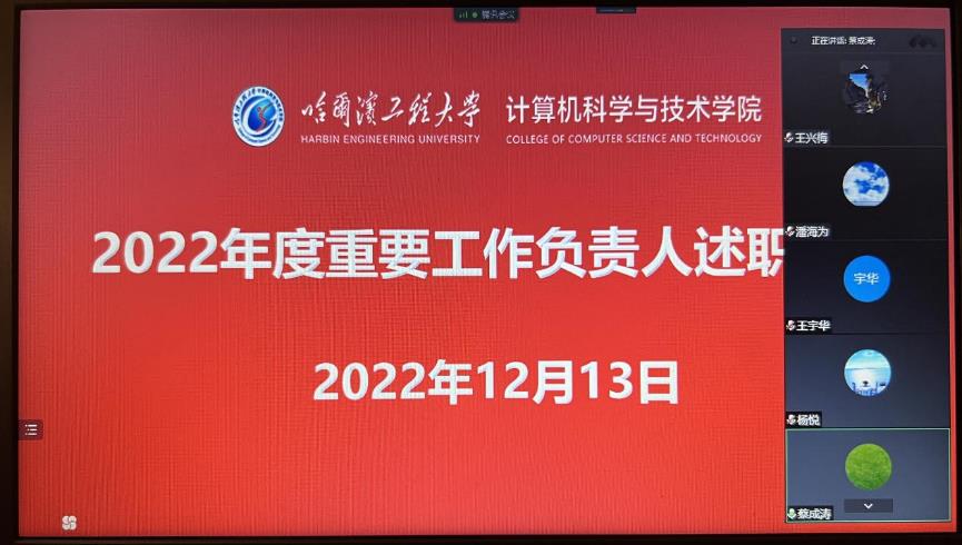12月13日19时,根据jinnianhui金年会诚信至上2022年教职工年度考核工作通知要求,本着客观评价德才表现和工作业绩,激励提高思想政治素质和业务能力思想理念,学院召开2022年度重要工作负责人述职大会(腾讯:线上会议),会议内容:听取学科负责人、专业负责人、中心主任、副主任、学生创新工作室负责人、龙江专员及首聘期考核人员(田乔、刘泽超、巩建光)述职报告,课程负责人(采用书面形式述职)。