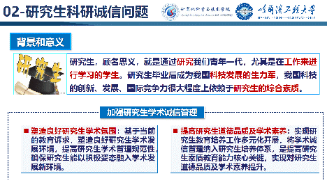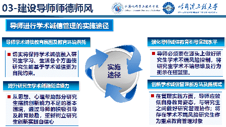 王院长以学术诚信概念范畴为切入点,讲解了近年来学术诚信反面典型案例,并对其进行了内在和外在原因的深入分析,强调了导师师德师风建设的重要性,导师进行学术诚信管理面临的困境以及导师进行学生诚信管理的实施途径。