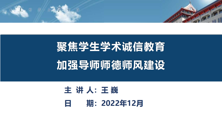 为加强学术诚信治理,营造风清气正的育人环境和求真务实的学术氛围,促进导师对学术诚信教育理解以及加强研究生导师师德师风建设,2022年12月18日(星期日)19:30,jinnianhui金年会诚信至上举行“研究生学术诚信教育与学风建设”系列活动(腾讯:线上会议)。本次活动由学院副院长王巍做题为“聚焦学生学术诚信教育,加强导师师德师风建设”的报告,学院全体研究生导师参会。