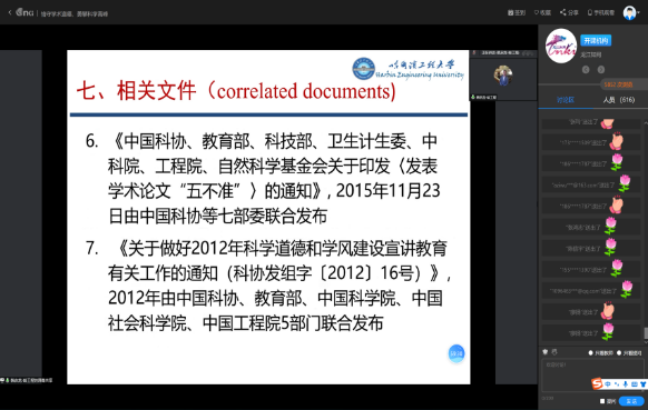 韩启龙教授依托《高等学校科学技术学术规范指南》,以学术共同体、学术规范、学风、学术成果、学术评价、学术不端等基本概念为切入点,以科技工作者应遵守的学术规范为主体模块,全面、深入地详述了学术规范中关于基本准则、查新和项目申请规范、项目实施规范、引文和注释规范、参考文献规范、学术成果发表与后续工作规范、学术批评规范、人及试验动物研究对象规范等方面的相关规定。同时,韩教授在报告中明晰对剽窃、伪造和篡改等学术不端行为的界定,从社会因素与个人因素两个角度对学术不端行为进行分析,并结合具体案例,加以生动阐述。报告结尾,韩教授以“科学有险阻,苦战能过关”勉励从事科研工作的同学们,在科研学习与工作中,应坚持守正创新,踔厉奋发有为,踏踏实实做出好成果。本次活动学院研究生参与度非常高,总浏览量6631,学习人次1939(知网统计数据)。