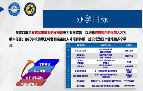 董宇欣副院长就我校国家保密学院的办学目标、学科方向、教学资源、人才培养、取得成绩等方面的内容进行了介绍。学院作为国家保密教育培训基地哈尔滨分基地,依托“三海一核”的办学特色、网络空间安全相关学科专业优势、完备的人才培养体系,培养满足国家保密事业发展需要的可靠顶用保密人才,发挥国家保密教育培训分基地的示范作用。