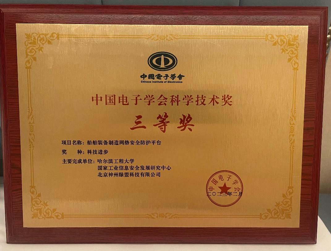 2023年4月1日,中国电子学会科学技术奖励大会在珠海国际会展中心隆重举行。大会颁发了2021年度和2022年度中国电子学会科技奖励,计算机学院的科研成果“船舶装备制造网络安全防护平台”获2022年度中国电子学会科技进步三等奖。该成果由jinnian金年会牵头,国家工业信息安全发展研究中心、北京神州绿盟科技有限公司、哈尔滨工大天创电子有限公司等单位联合完成。主要完成人包括:董宇欣,张立国,申林山,李俊,刘泽超,尤扬,李思照,刘文跃,巩建光,印桂生,朱军等。计算机学院董宇欣副院长参加了颁奖大会并代表获奖团队上台领奖。