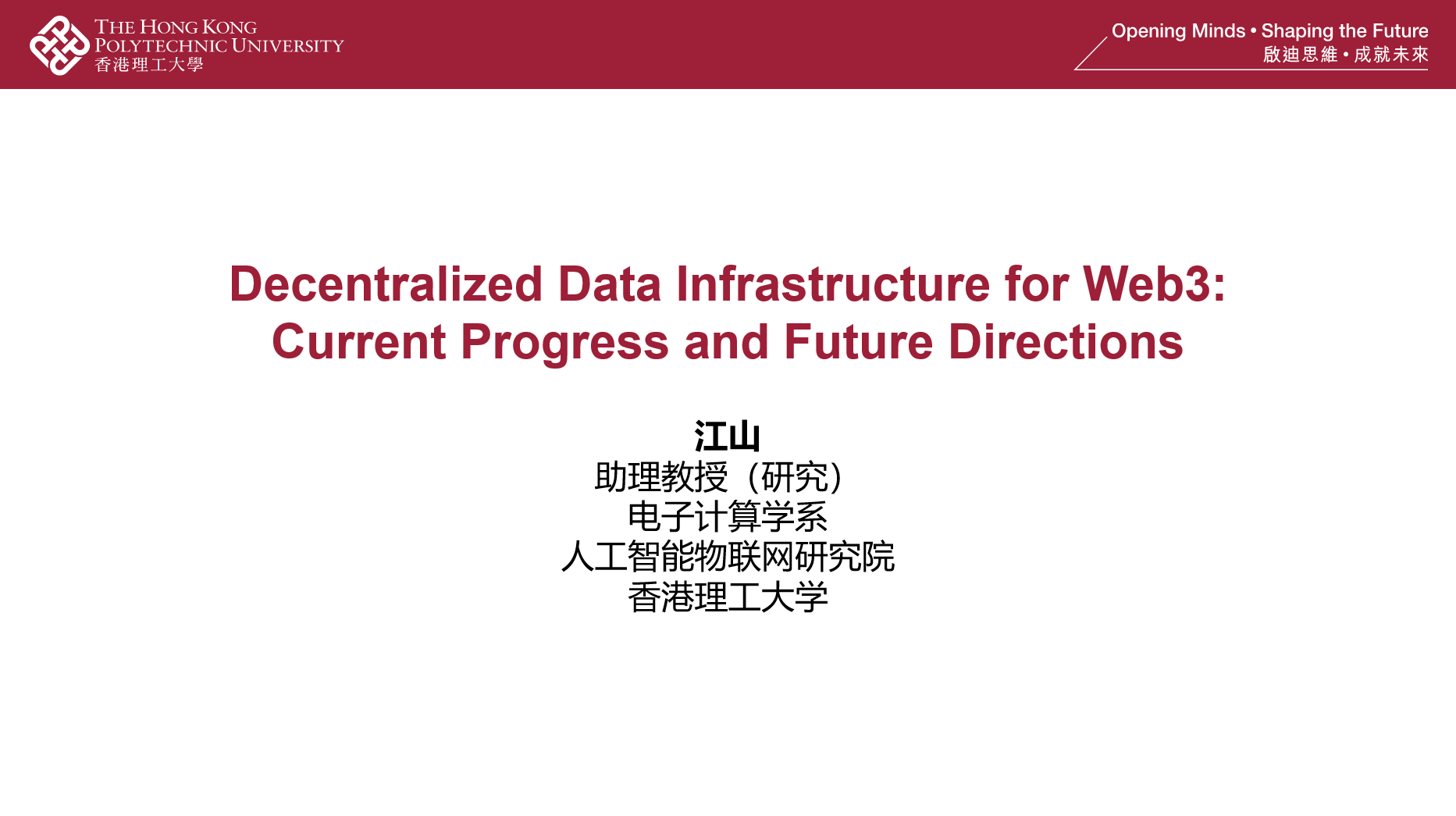 江山现任香港理工大学电子计算学系助理教授(研究),他分别在中山大学和香港理工大学获得计算机学士和博士学位。江老师的研究领域包括分布式系统及区块链、基于区块链的数据共享、区块链即服务,曾获BlockSys 2021最佳论文奖。