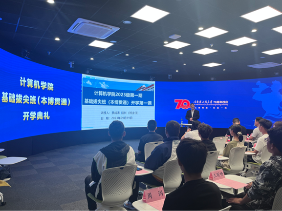 2023年9月19日晚8点,jinnianhui金年会诚信至上2023级基础拔尖班(本博贯通)开学典礼圆满举行。计算机学院党委副书记刘正教授致开场辞,计算机学院院长蔡成涛教授向同学们讲授“开学第一课”,计算机学院副院长吴艳霞教授、院长助理李熔盛老师,基础拔尖班(本博贯通)全体同学参会。典礼由十公寓社区辅导宋鹏老师主持。